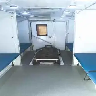Полки оборудованы ремнями для надежной фиксации пострадавших во время движения. Для поддержания жизнедеятельности в эвакуационной зоне выполнена разводка для подачи кислорода к каждому пострадавшему.